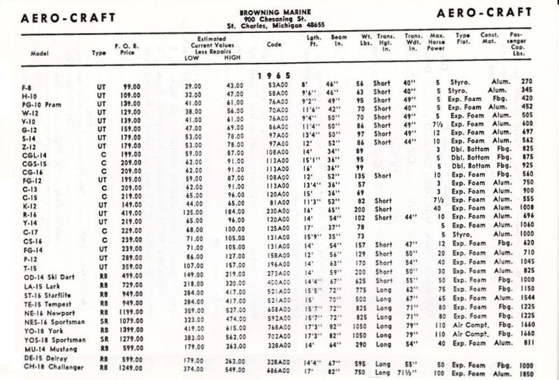 Revision as of 00:37, 13 November 2012 by HandyAndy (talk | contribs) (1965 Aero Craft outboard boat models from a 1972 outboard boat trade-in guide)