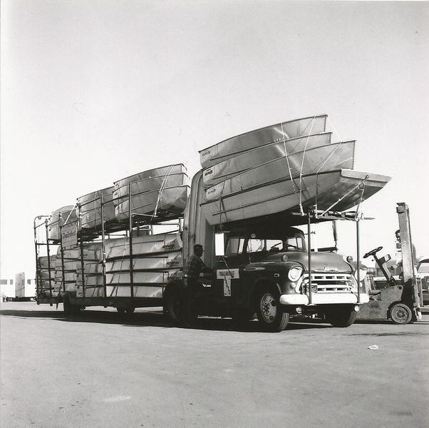 Photo of load of boats for delivery, year unknown