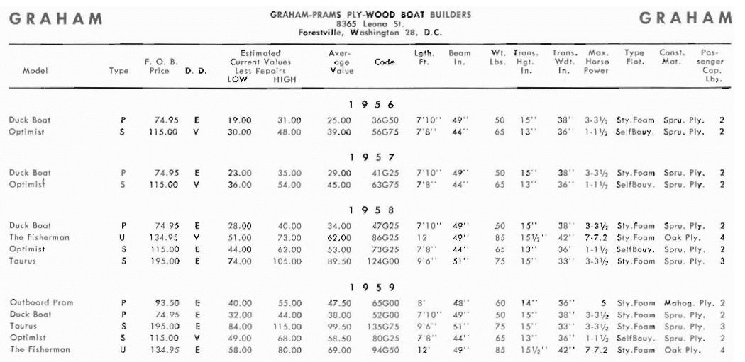 1956 to 1959 Graham outboard boat models from a 1960 boat trade-in guide